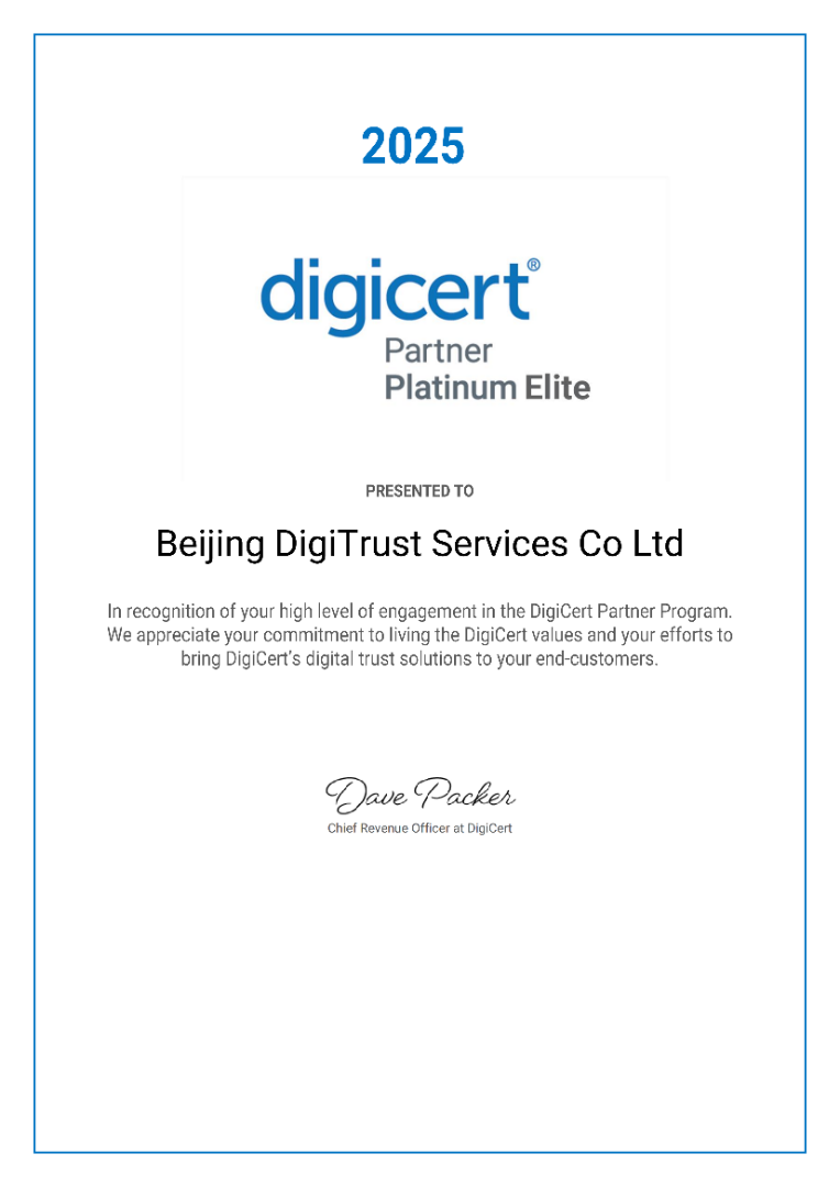 IDigiTrust是DigiCert授权的白金精英合作伙伴,也是其在中国的战略合作伙伴。公司专注于为中国企业市场提供数字信任解决方案的本地化服务,致力于成为中国本土数字信任服务的领先者。